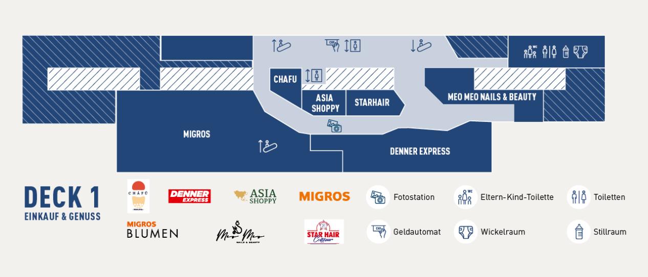 Die Welle7 bietet dir auf acht Decks alles Wichtige für deinen mobilen Alltag. Möchtest du wissen, wo sich ein konkreter Shop, dein Kursraum in der Klubschule Migros, die Lifte oder die Toiletten befinden? Du findest alle Informationen in unserem Centerplan: